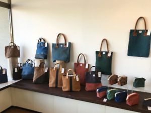 植物染料で染めた帆布と刺し子で仕立てたバッグの展示会。当日はセミオーダーも受け付けている。