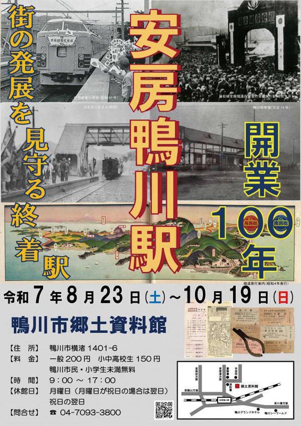 大正14年(1925)7月11日、北条線(現・内房線)の延伸により、安房鴨川駅が開業した。昭和4年4月15日には、房総線(現・外房線)が同駅まで開通し、房総環状線が全通。これにより、駅前には市街地が形成されていった。本展では、開業当時の賑わいや鉄道網整備の歴史、避暑客の増加などを通じて、安房鴨川駅100年の歩みを振り返る。展示品は、開業当時から現代までの写真、大正時代のガイドブックや時刻表、昭和40〜50年代の切符など。約97点を紹介する。