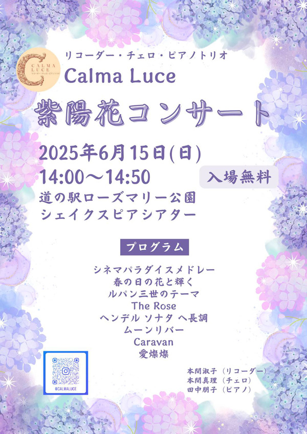 リコーダー・チェロ・ピアノトリオ「Calma Luce」による紫陽花コンサート