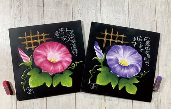 15㎝角の黒板に油性パステルでアサガオを描く。花の色は2色から選べる。下絵付きで小学生や初心者の参加も可。所要時間2時間程度。要予約。