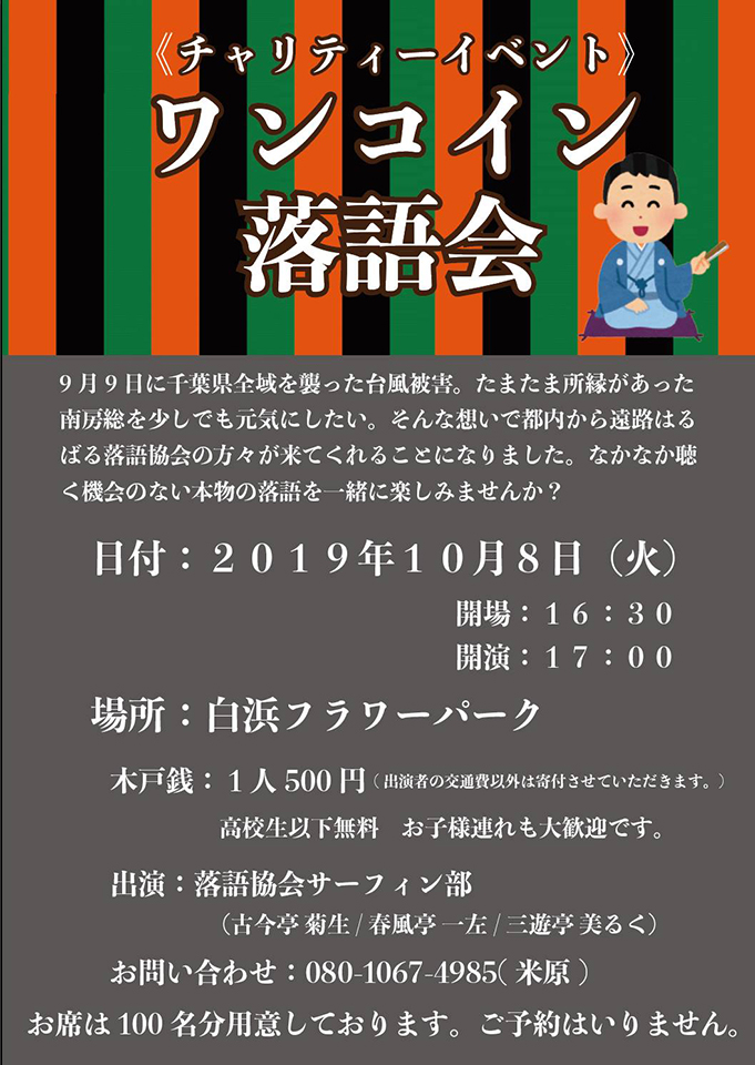 南房総を少しでも元気にしたい。本物の落語で笑ってみては。席は100名分用意している。予約不要。