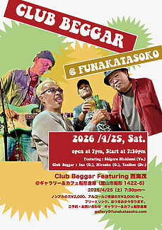東京、横浜界隈で活動するClub Beggarと、実力派ヴォーカリスト西海茂によるライブ。出演:稲和一(Vo・G)、平岡靖規(G)、大谷靖幸(Dr)、西海茂(Vo・G)