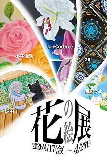 坂田仁、小林佳奈、Jun@odeme、Gill、渡辺うめ、個性的な作家5人による、色とりどりの花をテーマにした展示会。絵やハンドメイド小物などを展示する。