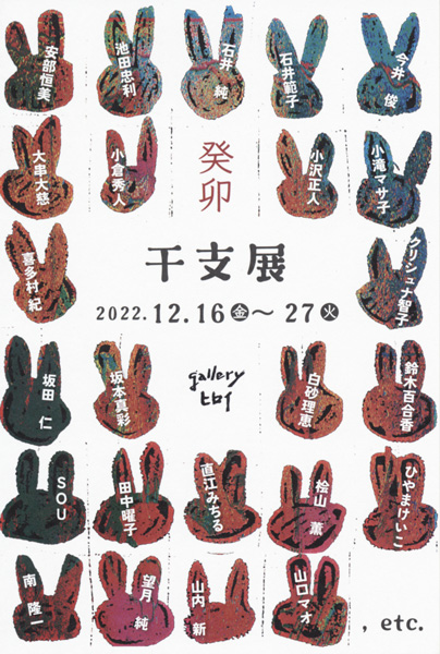 アーティストたちが制作した干支にちなんだオリジナル作品が大集合する。出品者:安部恒美、池田忠利、石井純、石井範子、今井俊、大串大慈、小倉秀人、小沢正人、小滝マサ子、喜多村紀、クリシュナ智子、坂田仁、坂本真彩、白砂理恵、鈴木百合香、SOU、田中曜子、直江みちる、桧山薫、ひやまけいこ、南隆一、望月純、山内新、山口マオ他