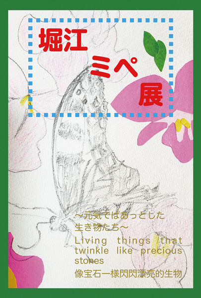 2匹の飼い犬の名前からとったペンネーム、堀江ミペさんによる多種のアート作品個展。折り紙の作品、色鉛筆やクレヨンで描いたドラゴンフルーツ、朝顔、犬、虫などの生き物たちの絵、絵付けした花瓶、自ら作った服や鞄を展示する。