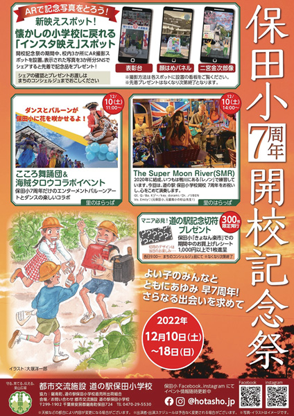 学校としての役目を終え、道の駅になって再生した保田小学校の7周年のアニバーサリーイベント。豪華景品が当たるガラポン大抽選会をはじめ、校内3か所に設置されたAR撮影スポット(アプリを使って、スマホをかざすと楽しいアニメーションで動きだす動画や写真で記念撮影ができる)や、道の駅記念切符プレゼントなどがある。週末は日替わりで大道芸、オリジナルドリップコーヒープレゼント(土・日曜9時〜、先着100名)、バルーンアートとダンス(10日11時〜)、ライブ(10日14時〜)、ストリートピアノ(17日、整理券配布あり)など盛り沢山。