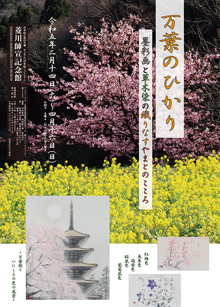 鋸山日本寺の天井画や襖絵などを制作している日本画家・佐藤隆良さんと、鋸南町在住の草木染研究家・藤井悦子さんが、万葉集の詩歌をテーマに創作した墨彩画と草木染の作品を展示する。