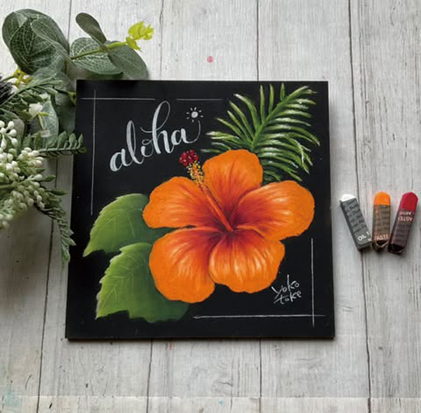 15㎝角の黒板に油性パステルで絵を描くチョークアートを体験。今回は3色を使ってハイビスカスを描く。下絵付き。小学生や初心者の参加も可。所要時間2時間程度。定員各回5名。要予約。