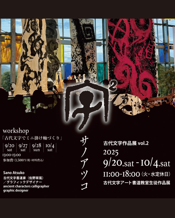 グラフィックデザイナーで書家のサノアツコさんによる古代文字(漢字原型)の作品展。各地教室生徒による作品展も共同展示される。会期中「古代文字でミニ掛け軸づくり」のワークショップを開催(9月27日[土]、28日[日]、10月4日[土]13時〜15時、料金:3500円[材料費込]、各回定員10名)。その漢字の成り立ちを聞いた後、古代文字で名前を書きミニ掛け軸に表装する。