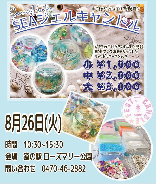 ガラスの中にカラフルな砂と貝殻を閉じ込めて海をデザインしたキャンドルを作る。大きさは3種類あり、料金も異なる(小1000円、中2000円、大3000円)。小学生低学年以下は保護者同伴。