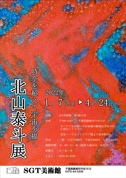 独特の絵画表現で内外に高い評価を得た異色画家・北山泰斗の大作7作品を公開。初期の『他人の空』から『丹水はモノローグ』に至るまで、始まりは空気や水で、やがて海の一粒の泡になり、さらに宇宙に浮遊する魂を絵画にした画家の心の変遷が窺える。