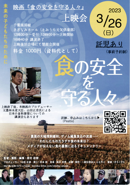 国内外で農と食の持続可能な未来図を描く人々を取材し、メディアが伝えない食の裏側に迫ったドキュメンタリー映画。上映終了後、プロデューサーで元農林水産大臣の山田正彦さんによる日本の食料事情についての講演会を開催。託児あり(事前予約)。