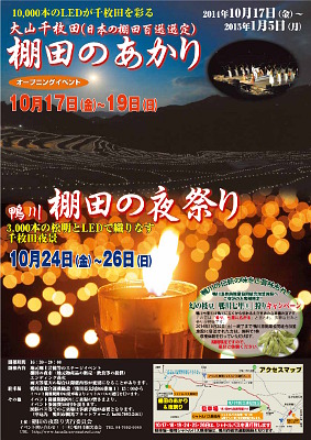 大山千枚田を1万本のLEDキャンドルでライトアップする「棚田のあかり」(1月5日まで)のメインイベントとして、10月24日から26日までの3日間開催されているのが「棚田の夜祭り」。