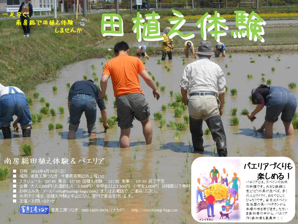 田植え体験 田植えが初めての方、田んぼに足をつっこんでみたい、春の南房総で遊びたいという方々を対象に、ちょっと田植えをやってみる企画。田植え体験の後はバーベキュー。