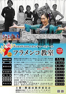 未経験者、入門者向けフラメンコ教室。全8回完結の講習で「アレグリアス」という明るい曲を覚える。年齢、性別、経験不問。勝浦市内在住・在学・在勤の方優先。動きやすい服装、飲み物、ヒールの太い靴やパンプス、なければ運動靴での受講も可。午前の部、午後の部どちらかを選んで、勝浦市生涯学習課に電話で申込み。応募は8月12日(火)まで。