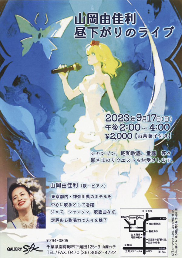 東京都内・神奈川県のホテルを中心に歌手として活躍する山岡由佳利さんのライブ。シャンソン、昭和歌謡、童謡等からリクエストも受けて歌う。