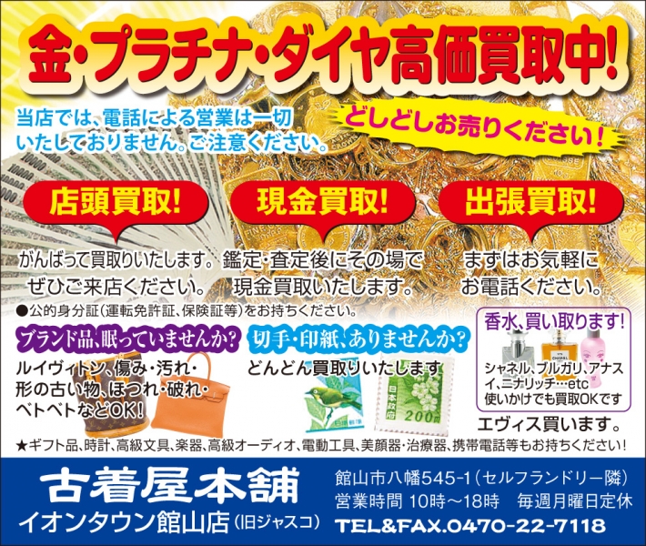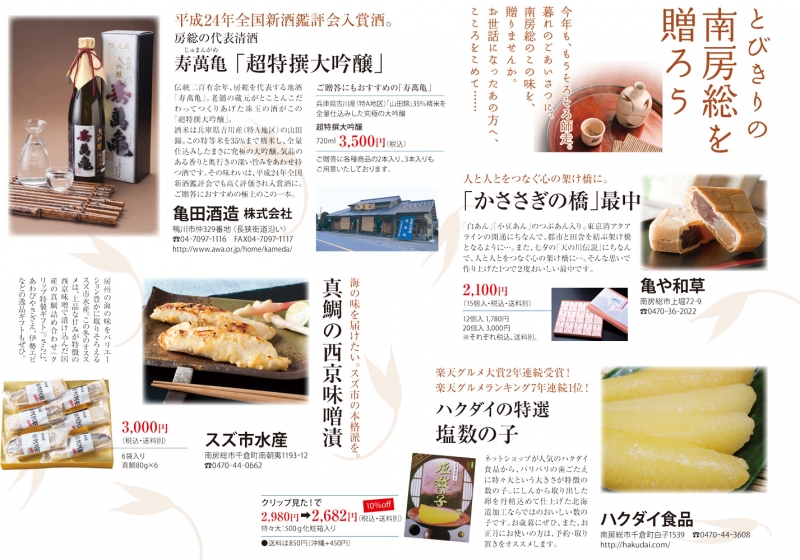 Bay2、BINGO、カットファクトリー館山店、エボリューション、ファミール産院、花清、波奈総本店、半十郎、古着屋本舗、石井工務店、イシイタカシ、仁幸夢店、寿々、鴨川はぴ婚、鴨川はり灸院、加藤建設、東急ハーヴェストクラブ勝浦、コバヤシ、レ・ドファン、M’s HOME、沼田屋、カーショップオアシス、オサダ、パレット、らん花園、シエスタ、スタイルサロン館山、杉木写真館、田辺薬局、たろべ、タテカン、戸倉商店、九重植木センター、渡辺(猫)、YOSAPARK、特集「とびきりの南房総を贈ろう」 (順不同・敬称略)