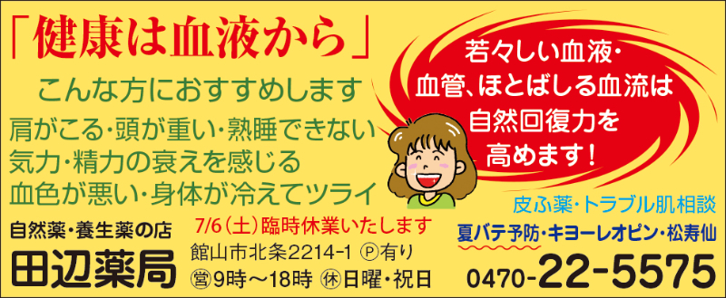 エイトホーム、アスカ、Bay2、カットファクトリー館山店、ファミール産院、ハミルトンホテル上総、半十郎、ハヤマミュージックスクール、古着屋本舗、仁幸夢店、加藤建設、君津文化ホール、メガネのコバヤシ、カーショップオアシス、パンダ美容室、レ・ドファンヨガスタジオ、リゾートイン白浜、スタイルサロン館山、杉木写真館、田辺薬局、タテカン、館山カラーサービス、南房総富浦ロイヤルホテル(順不同・敬称略)