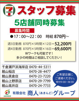 Bay2、KENJIWOOD、株式会社アイダ設計、エイトホーム、エムズホーム南房総、カットファクトリー、カネフク、茶房カフェノワール、英会話クラブサビーネ、ハヤマミュージックスクール、メガネDOO、加藤建設株式会社、館山カラーサービス、有限会社商人、株式会社城南パートナーズ、新昭和、新平、杉木写真館、石井工務店、田邉薬局、茂八すし(順不同)