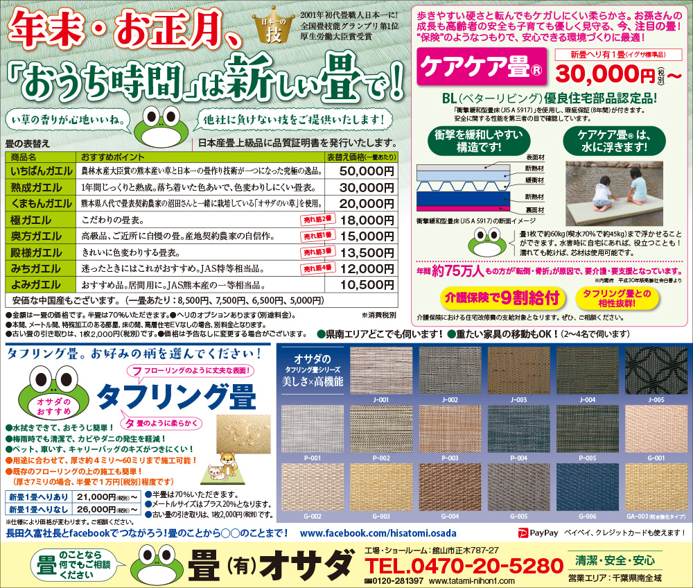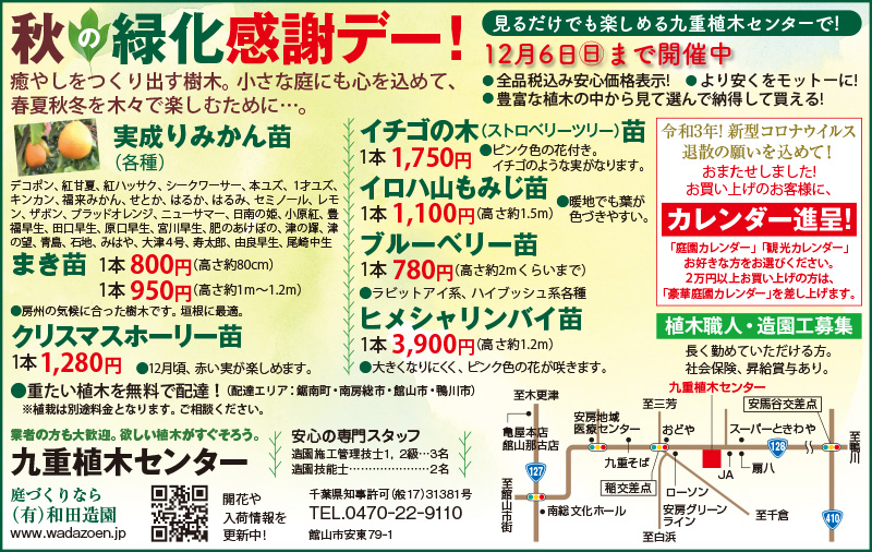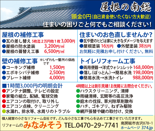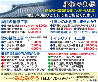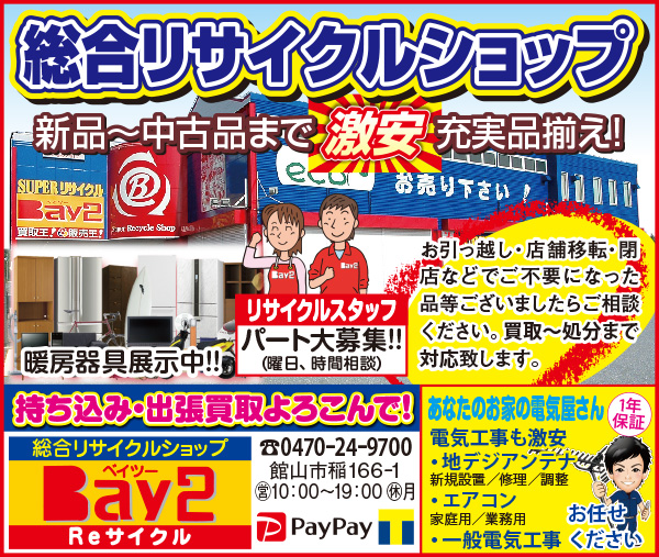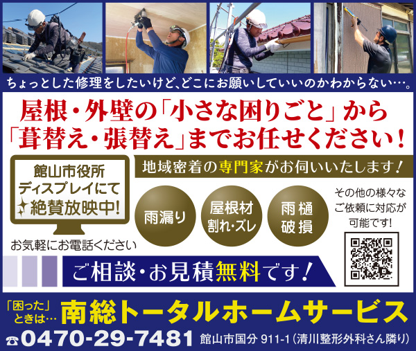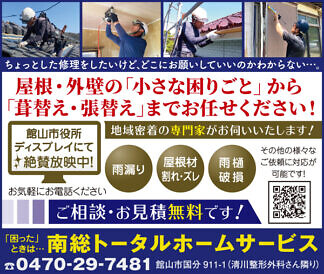 (有)和田造園、Bay2、アンディトレーディング株式会社、かおり庵、カットファクトリーα館山店、ハンバーガーショップビンゴ、リフォームのみなみそう、リラック館山店、英会話クラブサビーネ、加藤建設株式会社、株式会社石井工務店、鴨川はり灸院、館山リゾートホテル、君津市民文化ホール、畳(有)オサダ、仁・幸夢店株式会社、東栄建設株式会社、特別養護老人ホームリブ丸山、南総トータルホームサービス、芳喜楼、木こり商店、有限会社八幡工務店(順不同)