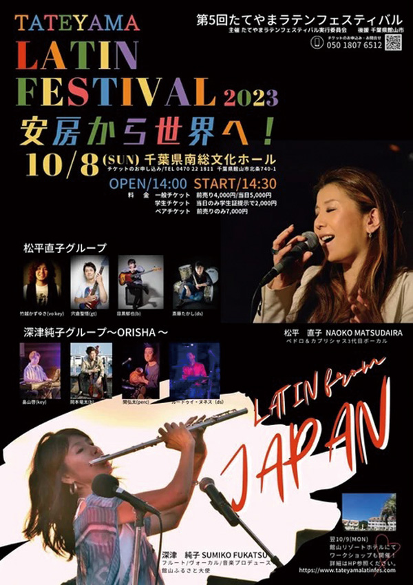 5回目となるたてやまラテンフェスティバルは、館山市出身で「ペドロ&カプリシャス」でヴォーカリストを務めた松平直子さんが率いるグループと、館山ふるさと大使でフルート奏者の深津純子さんが率いるORISHAが出演。翌日9日(月・祝)は館山リゾートホテルでワークショップを開催。詳細、前売りチケットのお求めはウェブサイトと左記電話から。
