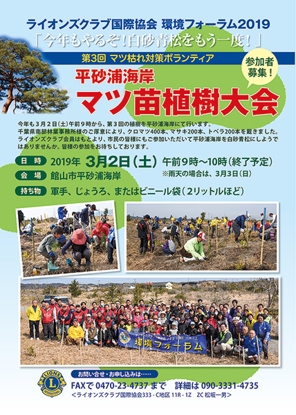 「白砂青松を取り戻そう」とライオンズクラブのボランティア活動として始められたマツ苗植樹大会。千葉県南部林業事務所より贈られたクロマツ400本、マサキ200本、トベラ200本を植樹する。軍手、じょうろ、またはビニール袋を持参。