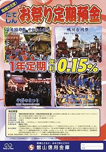 今回の「お祭り定期預金」のチラシでは、「安房国司祭やわたんまち」、「鴨川合同祭」、「平群のまつり」、「木更津みなとまつりやっさいもっさい」を紹介。地域の元気の源であるお祭りを盛り上げ、地域活性化に繋がれば、と企画された。
