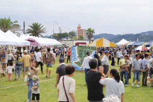 北条海岸の芝生広場と海を会場に、物販や飲食ブースだけでなく、ステージや体験メニュー、マリンスポーツなど、もりだくさんに盛り込んだのがこのイベントで、9月3日に開催された前回は天気にも恵まれ大盛況。今回は今年最後のビーチマーケットとなる。