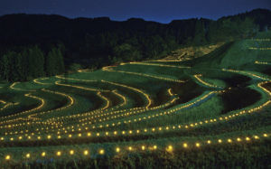 日本の棚田百選にも選ばれている大山千枚田で、毎年秋も深まる10月から開催されるライトアップイベント。 畦に沿って設置した、太陽光発電のLEDキャンドルが1万本、日没から4時間程度、雨でも点灯する。千枚田を幻想的に彩り、風物詩となったこの夜景は、年明けまで継続する。
