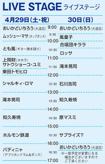 - 4月29(土・祝)30日(日)5月3日(水・祝)5日(金・祝)11時~14時