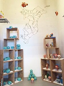 絵画、陶芸、ガラス、草木染め、鉄くずロボットなどアート作品に加え、アイデアいっぱいの手作りの品や珍しいグッズ、整体や占いなど、よりアーティスティックで楽しいショップが勢揃いする。