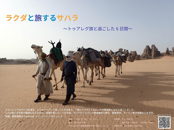 今年4月、アルジェリアのサハラ砂漠で、3人のトゥアレグ族と7頭のラクダとともに、6日間にわたり旅をした女性2人が、その様子を写真や動画を交えて報告する。登壇するのは南房総市在住のフリーライター・鍋田ゆかりさんと、鴨川市在住のセラピスト・川口未央さん。サハラやトゥアレグ関連資料の展示、雑貨販売、ターバン巻き体験なども実施する。詳しくはfacebookイベントページで「ラクダと旅するサハラ 〜トゥアレグ族と過ごした6日間〜」を検索。
