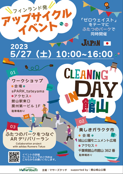 フィンランド発祥のアップサイクルイベントであるクリーニングデイを館山市内の2会場で同時開催。アップサイクルとは、古い不要なモノをリサイクルやリユースするだけでなく、そのモノに新しい価値や有用性を見出し、新たな使い手に受け継いでもらうことを目指すもの。城山公園では美しきガラクタ市と称した青空マーケット、sPARK_tateyamaでは手仕事のワークショップ、2会場を地産地消の野菜とジビエ肉をランニングしながら運ぶARデリバリーランを開催。