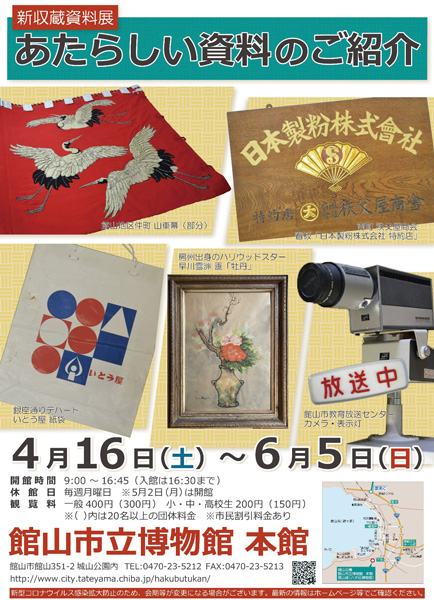 館山地区仲町の山車幕、房州出身のハリウッドスター・早川雪洲の絵画「牡丹」、いとう屋商店の紙袋など、興味深い資料が並ぶ。
