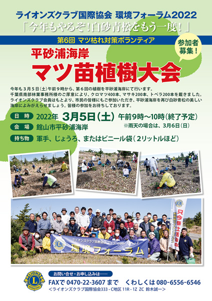 今年も千葉県南部林業事務所の協力を得て、クロマツ400本、マサキ200本、トベラ200本を植樹する。参加の申込みは電話で。持ち物は軍手、じょうろ又は2リットルほどのビニール袋。