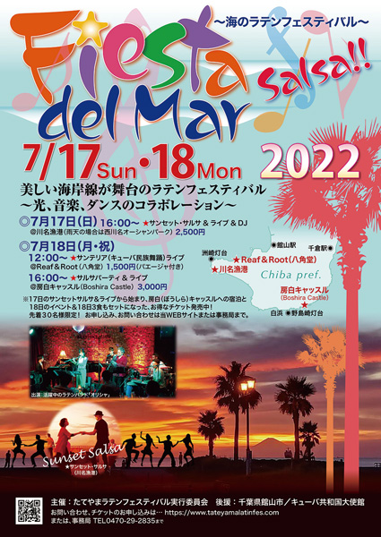 17日は夕日を眺めながら音楽とダンスを楽しむサンセットサルサ。DJによるラテン音楽のほか、キューバ音楽のライブやキッチンカーによる飲食提供も。館山駅から会場を往復するシャトルバスも用意されている。翌日18日(月・祝)は12時から八角堂、16時からは房白キャッスルを会場にラテンライブなどが開催される。詳しくは、サイト tateyamalatinfes.comまたはお電話で。