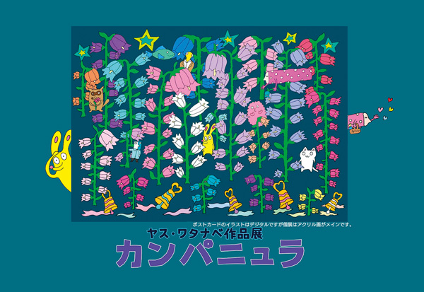 ユーモラスなキャラクターなどが自在に登場。みっちりと書き込まれたイラストの世界。若きクリエーター、ヤス・ワタナベさんの初めての個展。