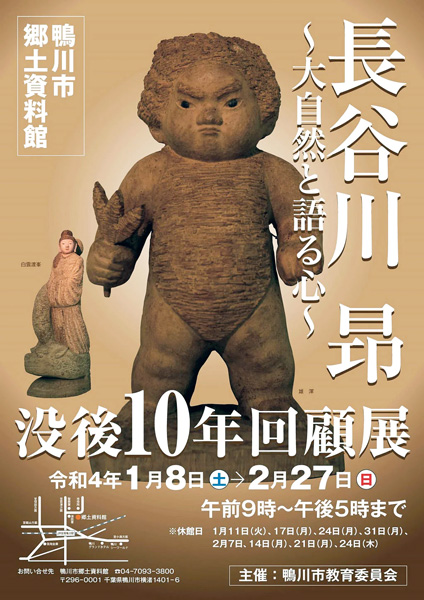 鴨川市粟斗出身で、同市の名誉市民だった長谷川昻氏は鉈彫りの彫刻家として、サイゴン国際美術展で最高賞の金メダルを受賞、日本木彫会展、文展・日展に彫刻作品を出品し、「現代の円空」と称された。鴨川市に寄贈された作品を展示し、軌跡を振り返る。
