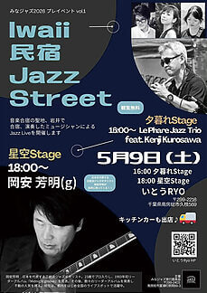 南房総市岩井を音楽合宿の聖地としてPRするためのライブイベント。16時からは岩井で合宿したミュージシャン達が、18時からは日本を代表する正統派ジャズギタリスト岡安芳明さんが演奏を繰り広げる。キッチンカーも出店。